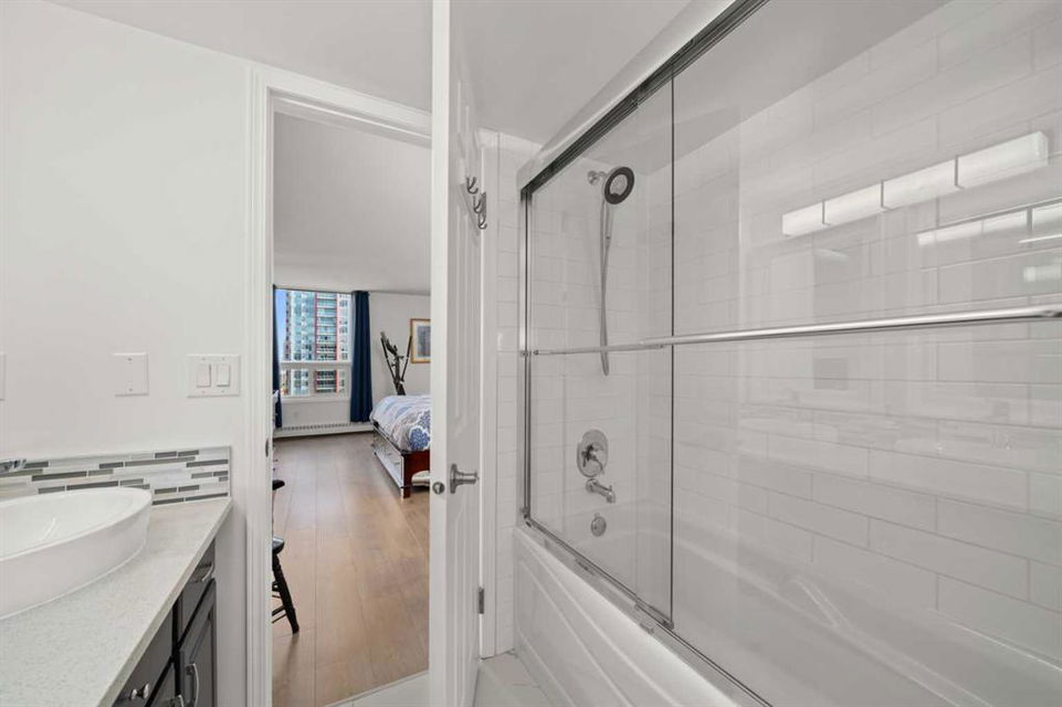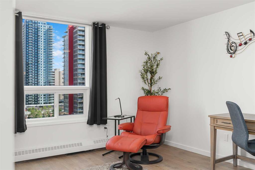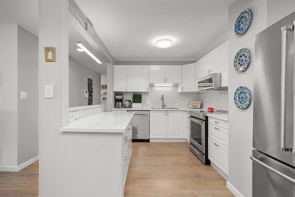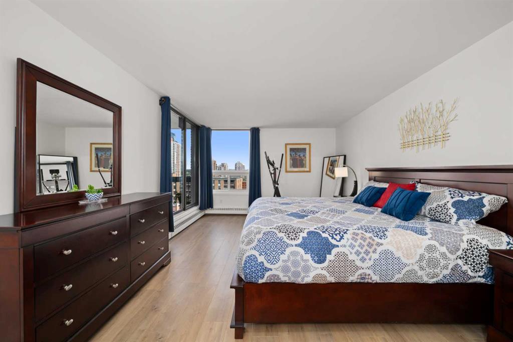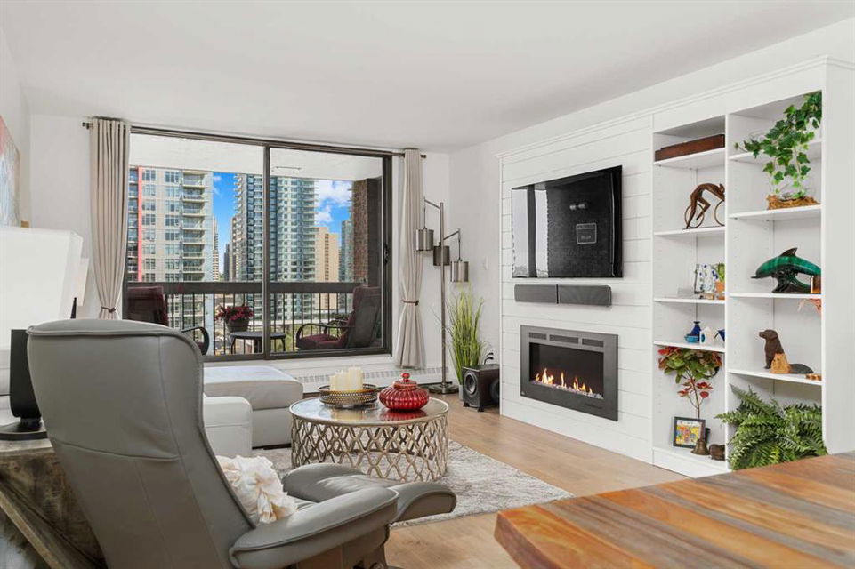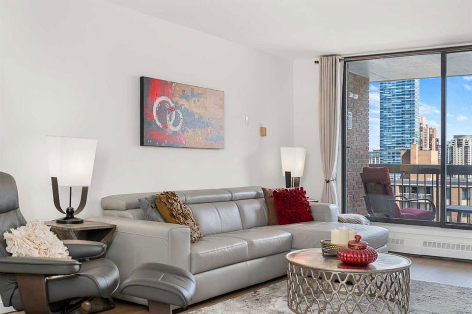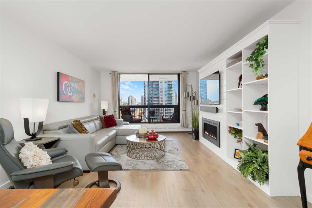 Discover an unparalleled opportunity to own a spacious 1,296 sq ft, fully renovated 2-bedroom, 2-bathroom condo on the 11th floor of The Royal Oak, of a premier Beltline building, listed at $519,900. Perfect for urban professionals, downsizers, or savvy investors, this move-in-ready masterpiece blends modern luxury with practical elegance in one of Calgary’s most sought-after neighborhoods. Step into a bright, open-concept living space featuring a stunning quartz kitchen with new KitchenAid appliances backed by extended warranties, a sleek backsplash, and plank flooring and ceramic throughout. The airy layout is enhanced by freshly painted walls, new doors and hardware, and the removal of dated popcorn ceilings, creating a contemporary aesthetic. Unwind by the built-in wall unit with an electric fireplace and TV mount, or step onto the cozy balcony with raised tile flooring to enjoy serene city views. Air conditioning ensures year-round comfort, while the in-unit storage and laundry, paired with a rare oversized parking stall and dedicated storage container, offer unmatched convenience in urban living.