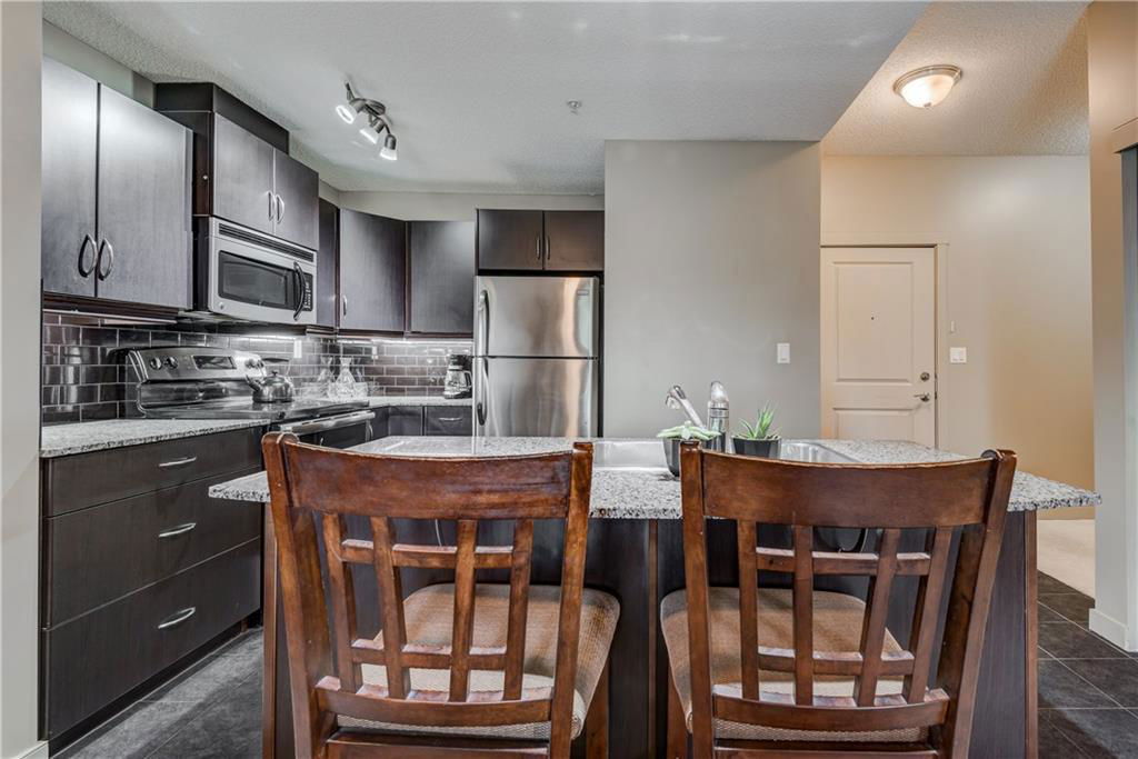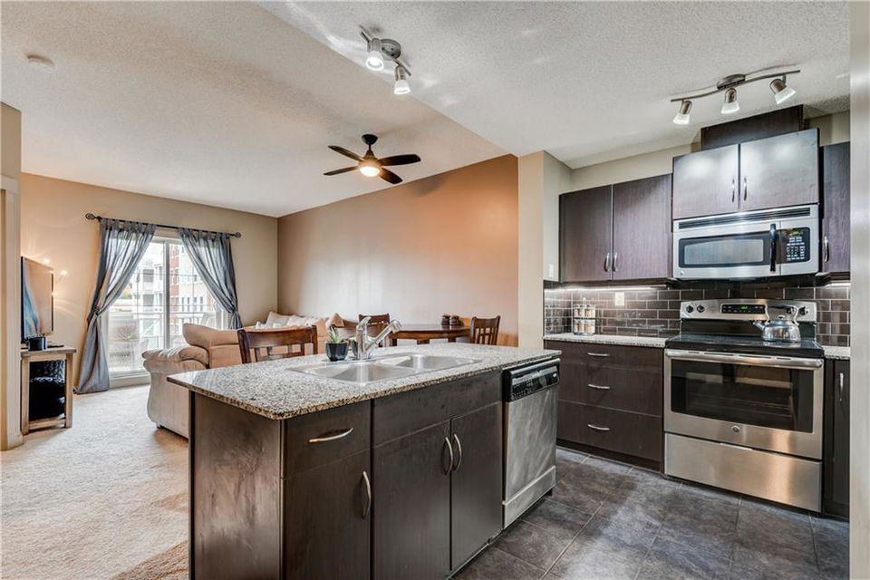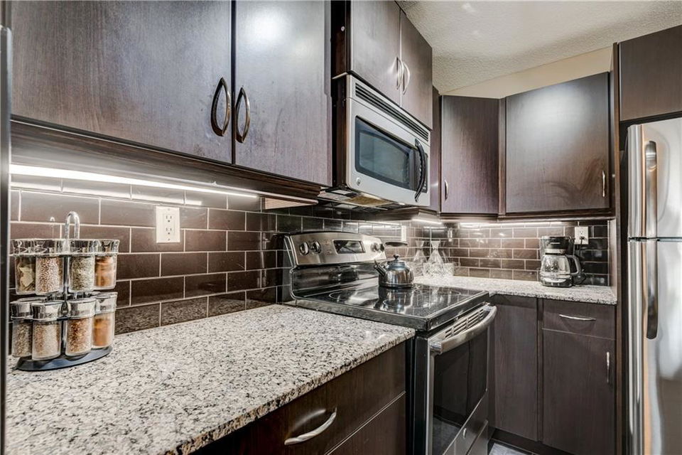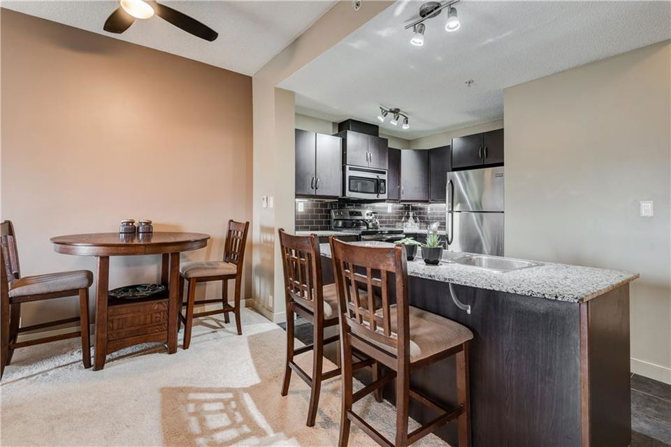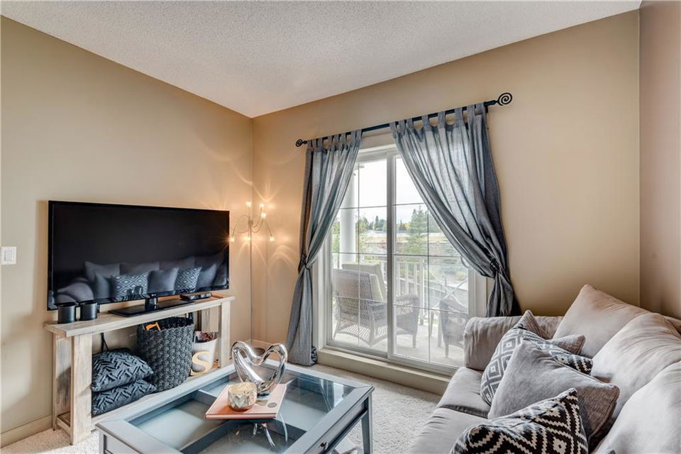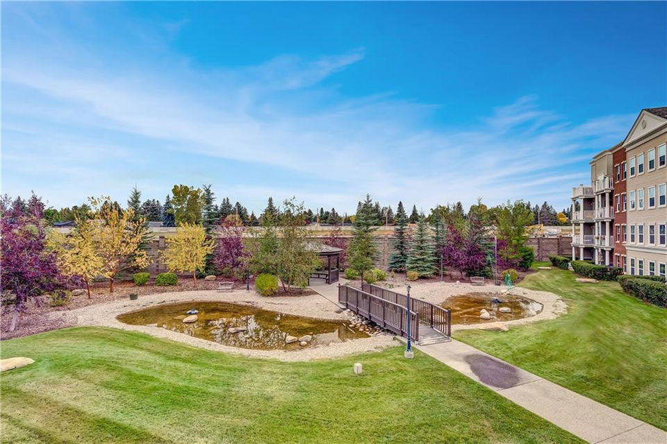 Own this condo for only $237/week*! This cozy home is loaded with upgrades! The kitchen has stainless steel fridge, stove, dishwasher and microwave. The beautiful granite counter tops and black back splash add to the sophistication of this kitchen. Enjoy the oversized kitchen island that accommodates an eating area. You have lots of natural lighting as the condo has a southern exposure – which gives your bedroom and living room plenty of sunlight. The bedroom has beautiful window shutters and plenty of closet space. The bathroom also boasts upgraded finishings. Enjoy your upgraded carpet and the in-floor heating. Step onto your balcony and enjoy view of the pond and the gazebo in the courtyard. There is even a den that you could use for a home office space. Have guests coming to town? Enjoy the Guest Suites and Owner’s Lounge. This building has an onsite gym and underground parkade that also accommodates guest parking. This unit has one titled parking stall. What more could you ask for? *conditions apply and subject to approval